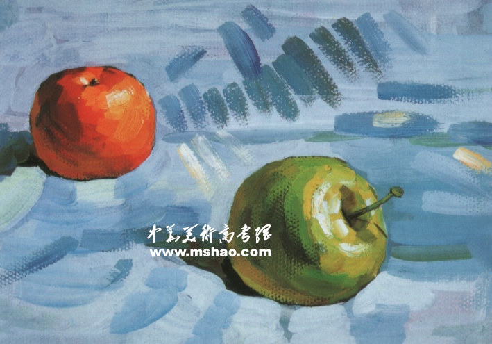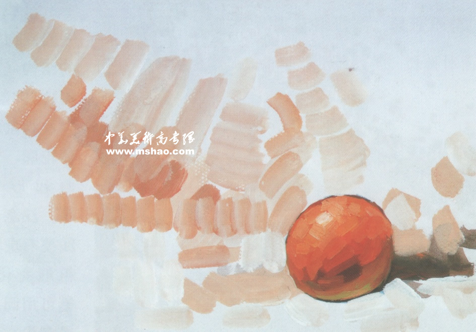 摆:也叫摆色块。用画笔调好颜色,一笔一笔地往上放,用大小不一方向不同的笔触来塑造物体。要点:下笔要肯定,用笔要顺着形体走,尤其在面与面的转折处,用色块接好。