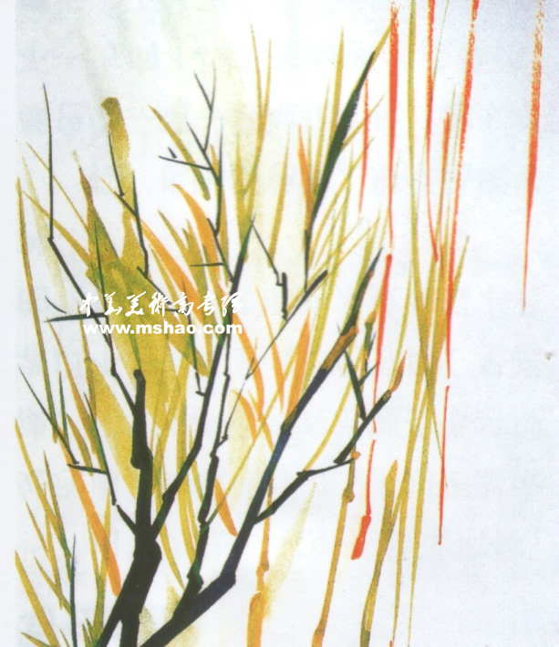 勾线:一般画物体的结构(如树枝、柳条)以上物象形体轮廓,作画起形等等。注意勾线要有虚实粗细变化,笔可用圆头笔或扁头笔。