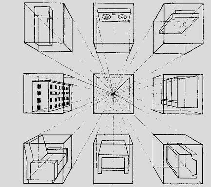 正六面体三组边线的透视方向是:有四条边线与画面垂直,有四条边线消失于左余点,有四条边线消失于右余点。(如下图所示)