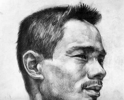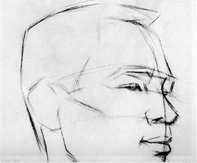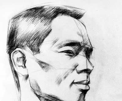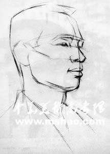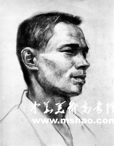 选择这种仰视的角度,可充分体现模特高大,壮实的特点,可先画出头部的最高、最低点,顶部空间少留一些,下面多留一些。由于青年是侧面正对前方,右边的空间应多留一些,给人留有想象的空间。然后用直线轻轻画出轮廓,定出五官位置。 对五官进行具体分析描绘,画出眼、鼻、耳、嘴的具体细节特征。这时要注意透视角度的变化对结构关系的影响。