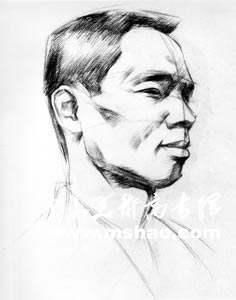 这个角度较难表现的是颧骨,耳朵及头发。描绘这几个地方时,切忌心烦意乱,而应理性分析。如刻画耳朵,是为了表现耳与头发、皮肤的关系;刻画颧骨、颞骨、是为了表现受光部的凹凸转承关系。头发的描绘要注意质感及随头骨的结构的起估变化。