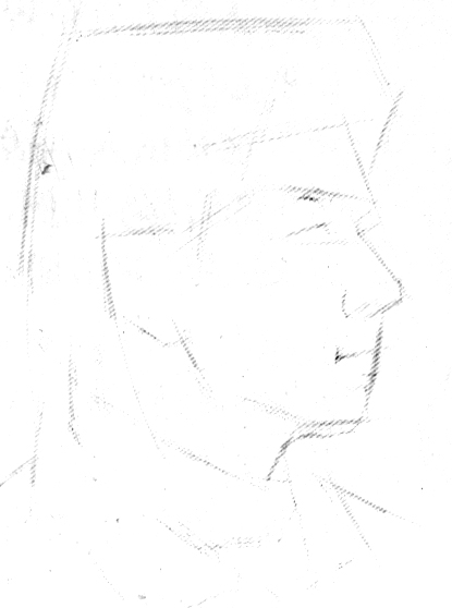 1、用虚线在画面上轻轻定出从头到下颌的位置,根据头部的基本形体,用长线淡淡定出了大的轮廓,注意头、颈、肩的穿插关系,构图不易过满。